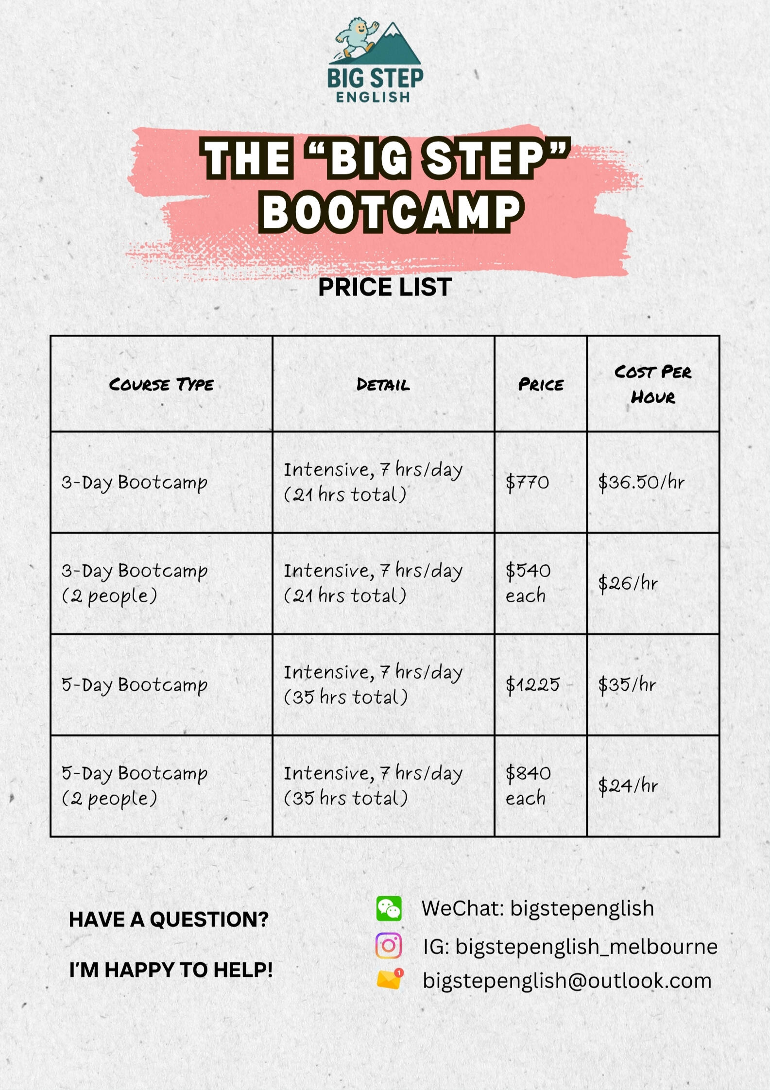 | 5-Day Bootcamp (2 people) | Intensive, 7 hrs/day (35 hrs total) | $840 each | $24/hr |